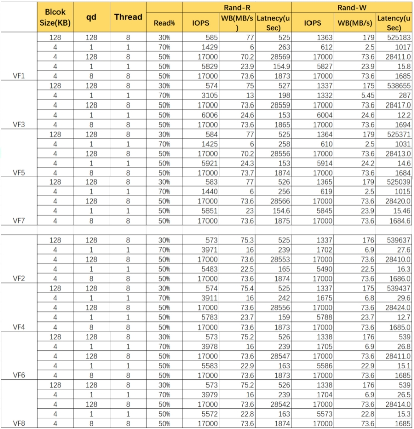 為了驗證QoS的能力,在1分8的場景下,對SSD進行了充分的性能測試驗證。數(shù)據(jù)顯示:在SR-IOV特性上,憶聯(lián)的QoS能力表現(xiàn)不俗,隔離效果明顯,基本可以做到在業(yè)務使用場景下相互之間并無影響,確保使用SR-IOV以后,也依然可以保障虛擬SSD盤的大帶寬、低時延。