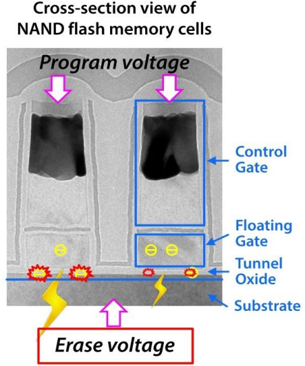 耐久度表征NAND Flash能夠承受的反復擦寫次數。NAND Flash的擦寫次數是有限的,因為每次擦寫操作都會對介質造成損傷。如下圖所示,進行擦寫操作時,會用十幾伏特的高電壓對晶體管進行充放電操作,當高能電子來回的穿越絕緣層,就會給絕緣層帶來物理損傷,最終影響數據可靠性。