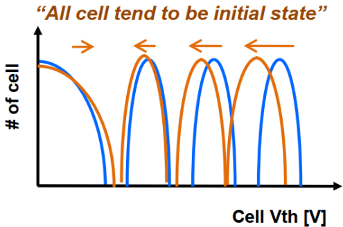 隨著時間流逝,受量子隧穿效應影響,編程操作充進去的電子會隨機發生電子逃逸,進而影響存儲的信息。如下圖所示,編程操作后的電荷分布如藍色線所示,Retention后電荷分布向左偏移,影響數據的正確讀取。