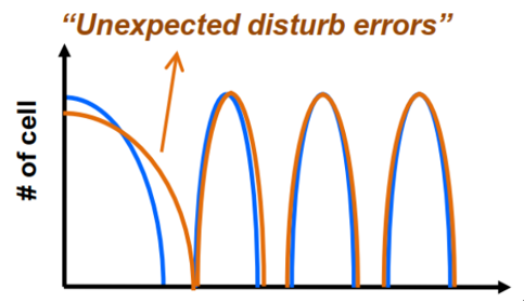受閃存陣列結構影響,我們去讀一個Page時,要對其他位置上的非讀page也施加一個電壓,造成讀干擾效應。讀次數較少時,讀干擾影響不明顯,但是當次數增加到幾千次時,累積的弱編程的效應也會影響數據可靠性。如下圖所示,較低的電荷狀態更容易受到干擾。