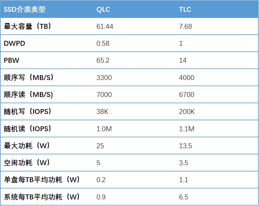 盡管QLC SSD的單盤功耗更大,但由于其單盤容量更大,因此QLC SSD每個TB的平均功耗更小。典型QLC SSD平均每TB功耗為0.2W,而TLC SSD平均每TB的功耗為1.1W。按照一臺服務器配置12片SSD、服務器(不含SSD)功耗500W計算,QLC SSD的整系統每TB功耗是0.9W,而TLC SSD為6.5W,兩者之間相差懸殊。