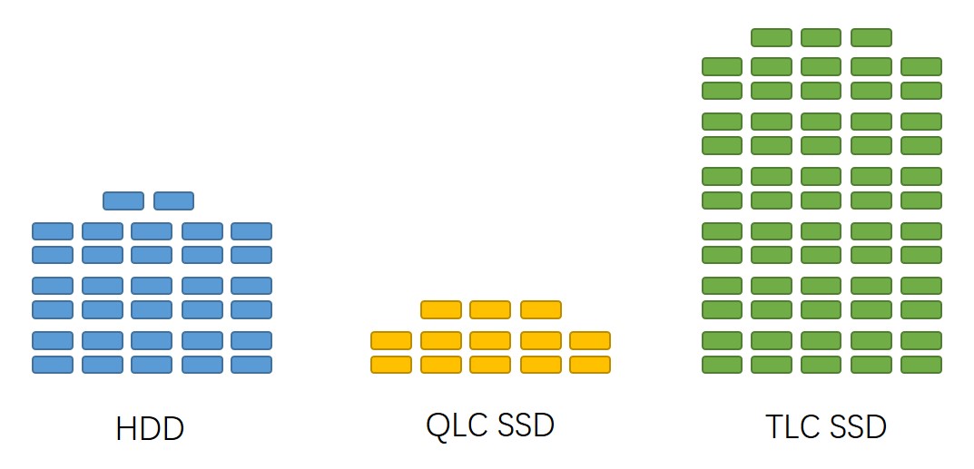 QLC SSD的單盤最大容量為61.44TB,而典型TLC SSD的最大容量為7.68TB。存儲相同數據量,QLC SSD占用更少的機架空間。在單盤故障的情況下,QLC SSD的影響范圍也更大。因此,QLC SSD更適合用在具有多盤之間數據冗余保護的系統中,如全閃陣列、全閃分布式存儲等。在這樣的系統中,單盤失效不會導致整個系統業務斷供。