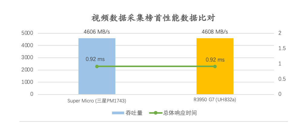 本次憶聯與H3C服務器為首次提交該測試的成績,搭載UH832a的兩款H3C服務器,各處理1000條視頻流,吞吐量數據接近(4605 MB/s及4608 MB/s),總體響應時間分別為1.02毫秒與0.92毫秒。其中,搭載UH832a的H3C UniServer R3950 G7服務器成績,再次追平Super Micro Computer AS-1115CS-TNR服務器性能,同列榜首。