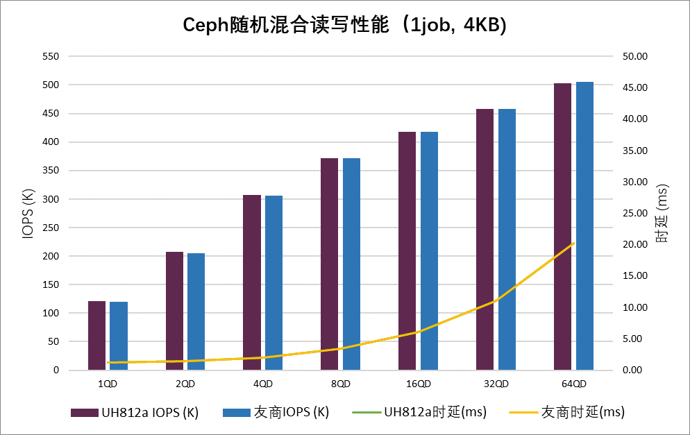QD為32時,UH812a混合讀寫IOPS超過50萬,時延約為20毫秒。