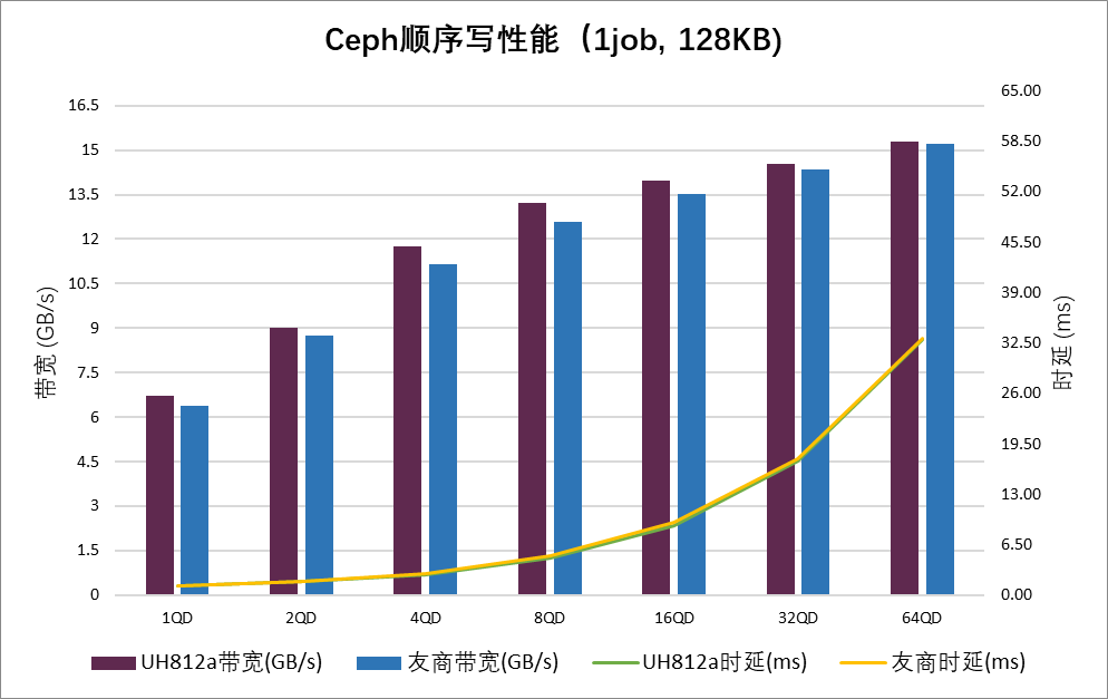 隨著QD數量的增加(QD在64之內),帶寬顯著增長,時延增長緩慢。QD為64時,UH812a順序讀帶寬超過56GB/s,時延為8.85毫秒,平均性能與友商持平;順序寫帶寬超過15.3GB/s,時延為32.88毫秒,平均帶寬超出友商3.15%,平均時延低于友商1.68%。