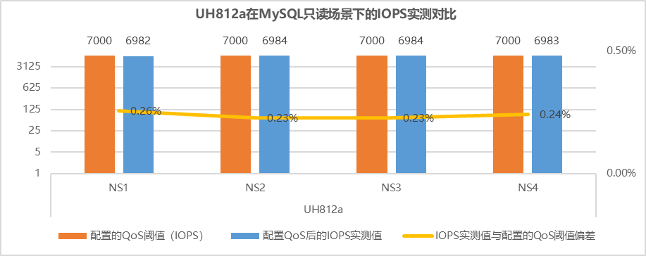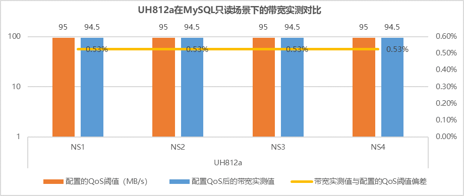 實測表明,在容器化 MySQL 環境中,無論是只讀、只寫還是混合讀寫場景,UH812a 的 NS 技術均能精準執行 QoS 設置,提供高效穩定的性能表現,有力支撐企業數據存儲與處理需求。