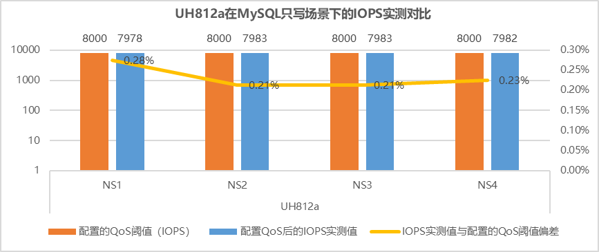 在只寫場景下,當IOPS的QoS閾值設置為8000,帶寬的QoS閾值設置到140MB/s時,UH812a依舊展現出強大的流控實力。在IOPS性能方面,其與QoS閾值的最大差距僅為0.28%;在帶寬性能上,最大差距也不過1.86%。由此可見,基于Docker化MySQL環境,UH812a NS技術下的QoS功能執行穩定且高效,整體性能波動范圍牢牢控制在2%以內,為高負載業務提供堅實保障。