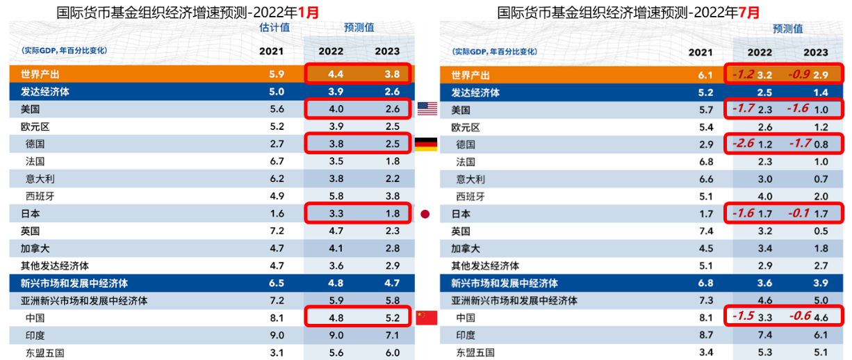 在去年底或今年初時,專家們和媒體對2022年宏觀環境普遍樂觀,部分觀點更是認為,2022年將終結疫情,在此基礎上,經濟將獲得較大的增長動力。然而,隨著俄烏戰爭的爆發,全球性的通脹壓力,國內此起彼伏的疫情,消費市場的疲弱相繼出現,輿論的預期開始逐步向下,公眾意識到經濟環境的不確定性正在增加。國際貨幣基金組織(IMF)分別在今年1月和7月對全球經濟增速進行了預測,后一次預測數據較前一次有明顯的下調。