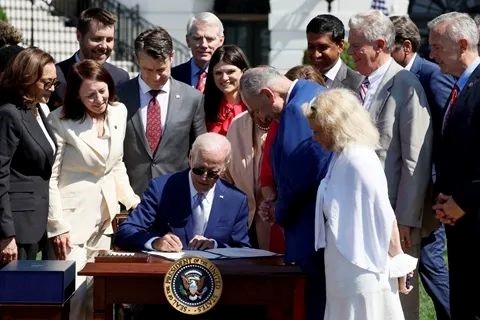 2022年8月9日,拜登簽署《2022年芯片和科技法案》。圖來自Evelyn Hockstein/IC photo