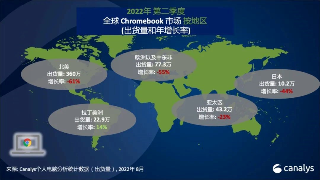 而Chromebook的疫情紅利期也正式結束,得益于因新冠疫情期間線上教育需求的激增,Chromebook在過去兩年實現了爆發式的增長,然而隨著北美、日本等主要市場的需求飽和,以及消費者購買力減弱導致庫存的大幅增加,全球Chromebook市場開始受挫。至2022 年第二季度,全球Chromebook主流市場出貨量皆出現斷崖式下降,當季全球出貨515萬臺,同比下降57%。