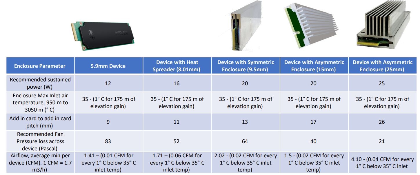 對不同功率的需求,E1.S采用了不同的標準外殼和散熱器尺寸:對于20W以下的卡,可以使用9.5mm厚度的對稱外殼/散熱片;對于更高功率的應用,則設計了一個不對稱的散熱器,厚度達到25mm,并允許25W。9.5mm的對稱外殼對于大多數SSD用例來說是足夠的;25mm非對稱外殼+散熱器更適合于非固態硬盤設備;對于更注重高性能的應用場景,15mm和25mm厚度的E1.S是更為理想的選擇。