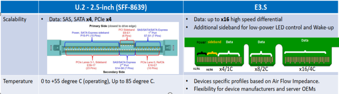 從上圖SFF-8639接口看,紅色標識的為PCIe,能使用4個通道,但限制了更高帶寬和性能的提升空間。另外企業級厚度為15mm,相對E3.S薄盤7.5mm限制了密度的提升。