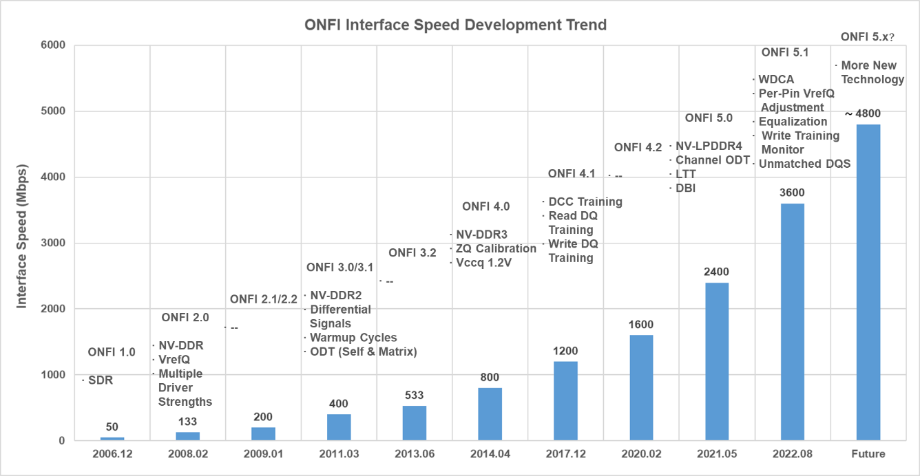 從ONFI 1.0到近期最新發(fā)布的ONFI 5.1可以看出,為了匹配系統(tǒng)前端接口(如eMMC/UFS/PCIe)越來越高的帶寬要求,NAND Flash接口速率整整提升了72倍,而且未來還將快速走向下一個峰值。