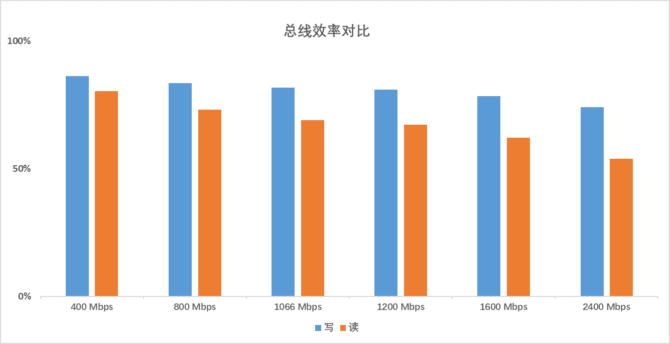 NAND Flash總線上傳輸?shù)男盘柨煞譃槊?、地址和?shù)據(jù)3種,通過DQ[7:0]時分復(fù)用,在不同的時刻分別傳輸命令、地址和數(shù)據(jù)。其中,數(shù)據(jù)是同步傳輸、差分采樣,速率較高;但命令和地址是異步傳輸、單端采樣,速率較低。從ONFI 1.0到ONFI 5.1,接口速率得到了飛速發(fā)展,但命令、地址和數(shù)據(jù)的傳輸形式基本不變。實際上,隨著總線速率提升,改善的主要是數(shù)據(jù)傳輸時延,命令和地址的傳輸時延并沒有得到改善,對系統(tǒng)而言總線使用效率是在不斷下降的。如下圖三在樂觀的場景下比較了寫/讀場景的總線效率,可以看到,讀和寫的總線效率都在逐漸降低,尤其是在讀場景跌落到50%左右時進一步加劇了系統(tǒng)設(shè)計的挑戰(zhàn)。