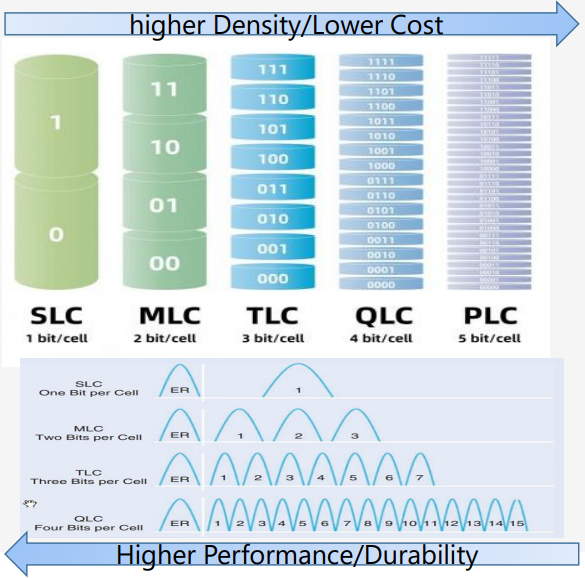 隨著存儲密度不斷增加,3D TLC (3bits/cell)成為主流存儲介質,3D QLC (4bits/cell)蓄勢待發。但是隨著密度的增加,可靠性會隨之降低,所以在應用的時候需要格外小心?,F在PLC(5bits/cell)處于實驗室技術預研階段,將持續提高存儲密度。