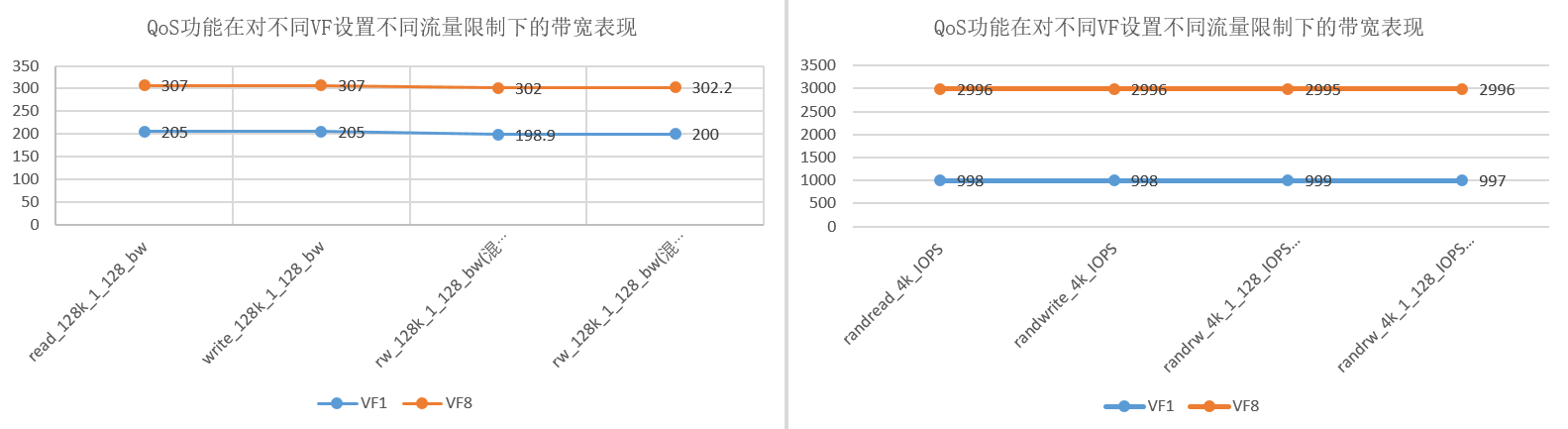 圖 2:QoS 功能在對不同 VF 設(shè)置不同流量限制下的帶寬及 IOPS 表現(xiàn)