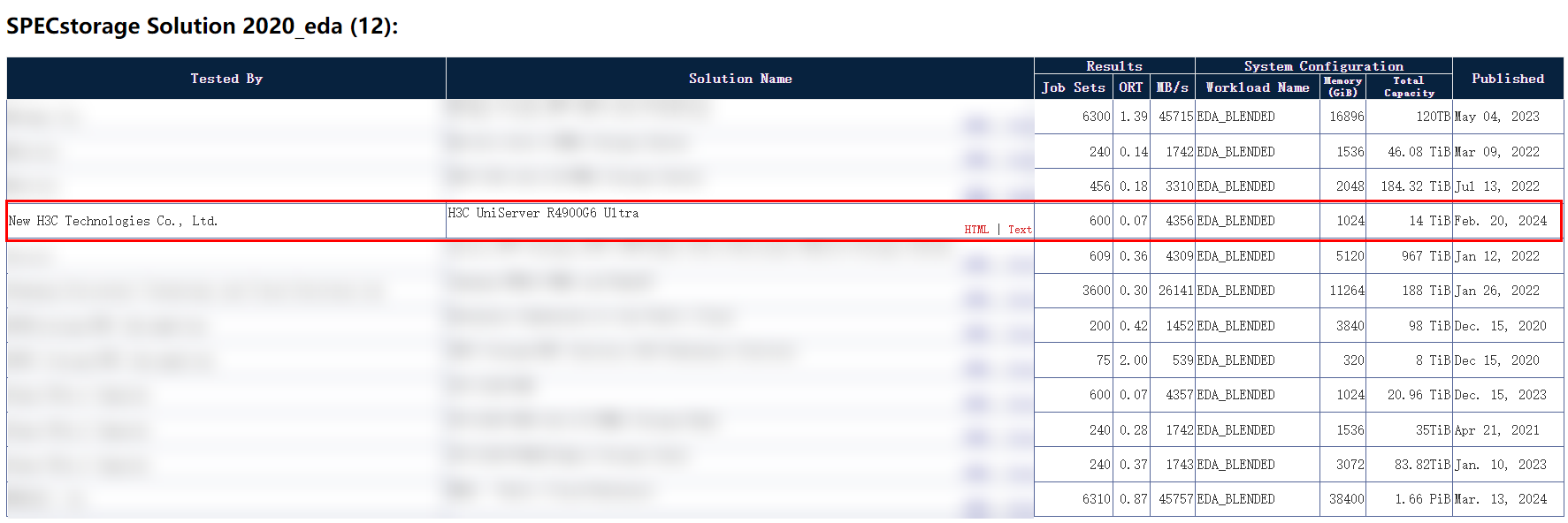 近日,國際標準性能評估組織(Standard Performance Evaluation Corporation, SPEC)的SPECstorage Solution 2020基準評測中,搭載憶聯企業級固態硬盤UH811a的新華三UniServer R4900 G6 Ultra服務器在AI_IMAGE、EDA_BLENDED、SWBUILD場景中性能表現優異,總體響應時間(overall response time, ORT)均處于領先水平,從側面印證了憶聯企業級產品可為服務器在性能、可靠性、能效和可擴展性方面帶來顯著優勢。