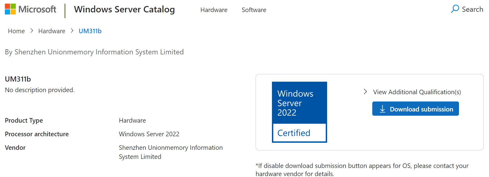 微軟WHQL認證是Windows Server操作系統下硬件兼容性的權威認證。繼憶聯企業級SSD UH8系和數據中心級SSD UH7系通過微軟WHQL認證后,憶聯UM311b成功獲得此認證,意味著憶聯UM311b與Windows Server 2022操作系統完全兼容,可充分保障憶聯UM311b在Windows Server系統中的穩定性,為使用Windows Server系統的企業用戶帶來流暢的數據存儲體驗。