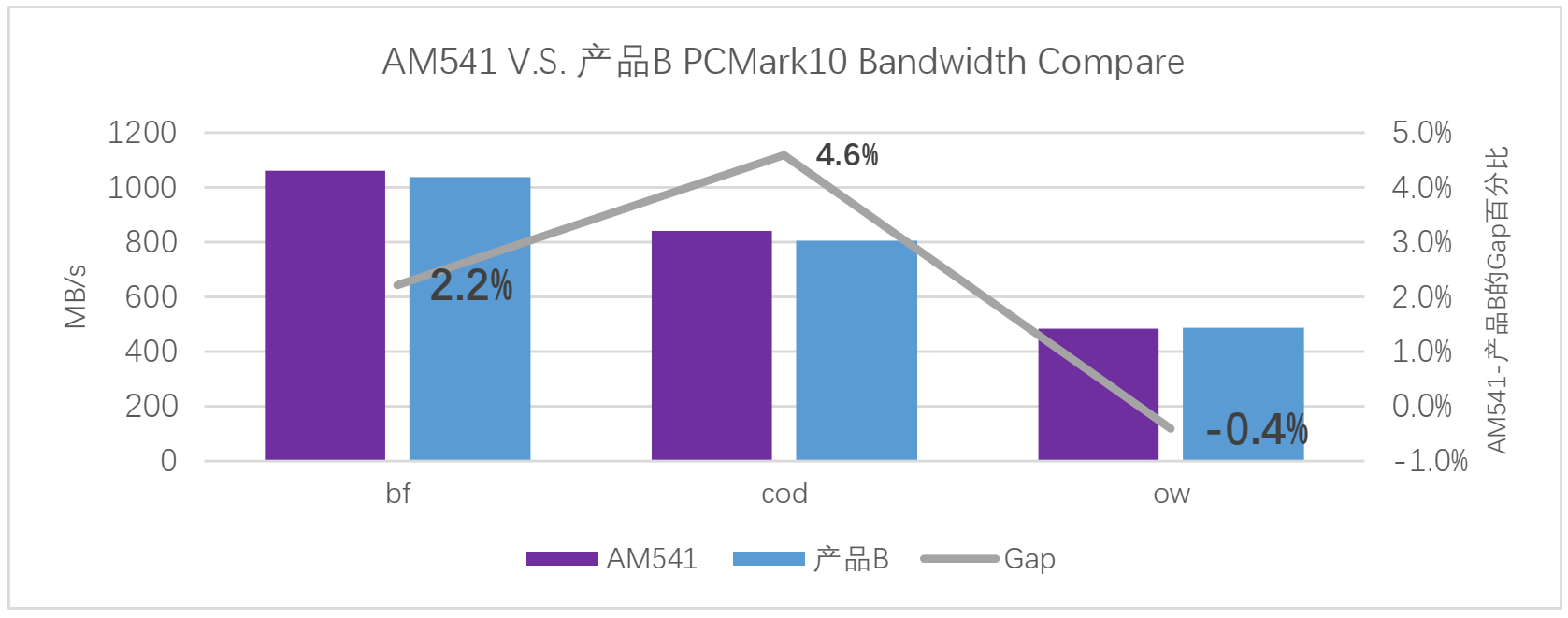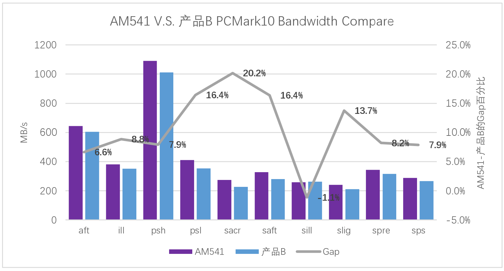 AM541采用Big SRAM策略,在QD1 Latency、讀寫混合等場景下性能表現出色,加之硬件通路加速和軟件算法優化,使其在游戲加載、辦公效率、數字內容創建等常用場景下性能發揮優異。在PCMark10測試中,AM541跑分超過3700,比國內某友商同類產品B高出約300分。