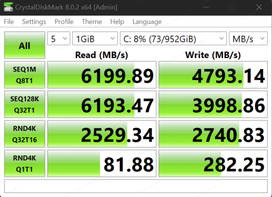 ?IO加速、性能卓越:AM541搭載憶聯新一代Jaguar6020主控,內置高容量SRAM及IO加速模塊。順序讀寫速度最高可達7000 MB/s、 6000 MB/s ,4KB隨機讀寫速度最高可達900K IOPS、850K IOPS。