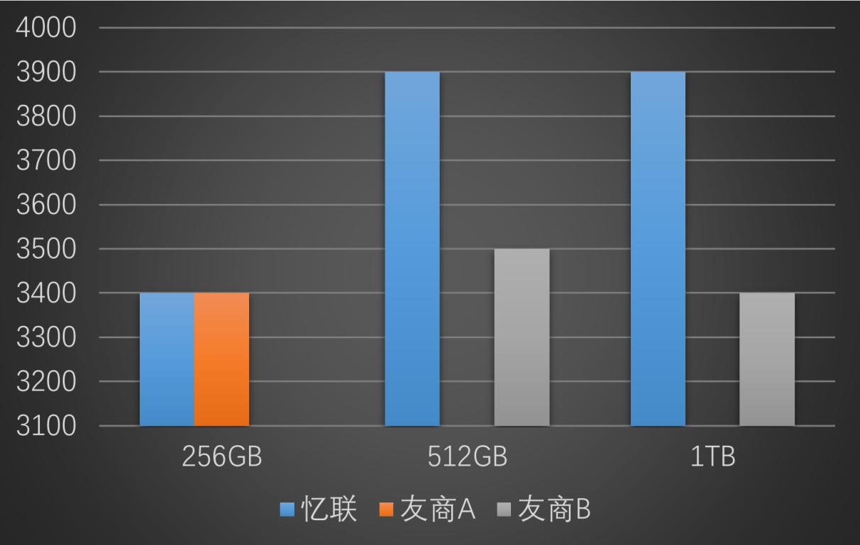 在PCMark10測試中,AM6C1 512GB、1TB容量的跑分均超過3900,比友商B的同類產品高出10%,256GB測試得分也與友商A的同類產品基本持平。