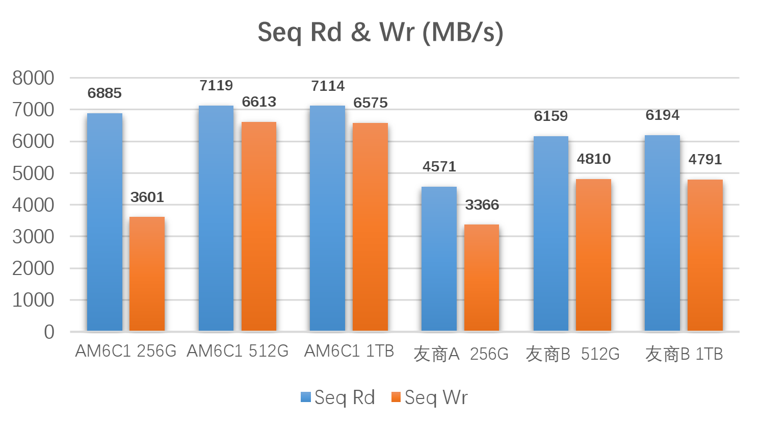與此同時,無論是順序讀寫還是單隊列深度的隨機讀寫,AM6C1性能均優于友商。其中,512GB容量的順序讀寫速度分別超過7100 MB/s和6600MB/s,比友商B同類產品的性能數據分別高出16%、30%以上,4KB隨機讀取性能也略高于友商B的同類產品。