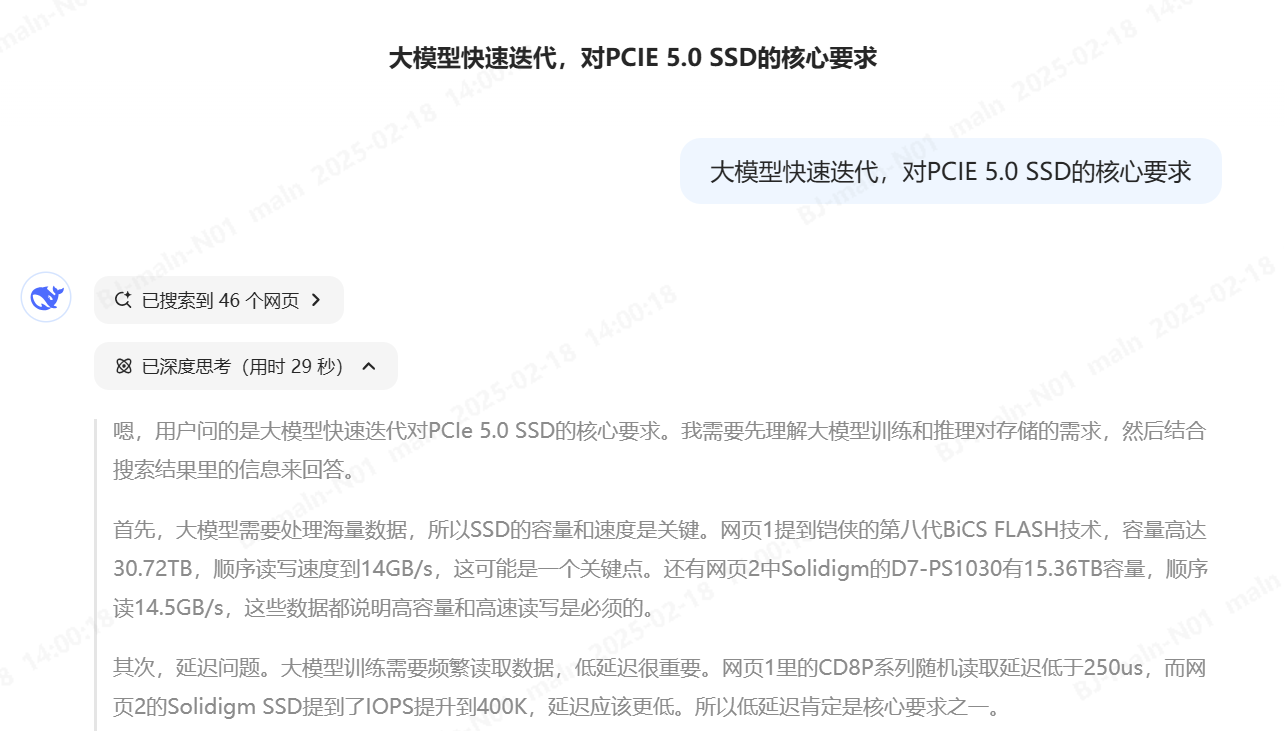 我們借助DeepSeek深度思考和聯(lián)網(wǎng)搜索能力將“大模型快速迭代,對(duì)PCIe 5.0 SSD的核心需求是什么”輸入給DeepSeek后,它給出如下回復(fù):“大模型的快速迭代對(duì)存儲(chǔ)系統(tǒng)提出了更高要求,尤其是PCIe 5.0 SSD作為關(guān)鍵數(shù)據(jù)載體,需在讀寫(xiě)性能、延遲、容量、可靠性等多維度全面突破,才能支撐大模型訓(xùn)練/推理的實(shí)時(shí)性需求。”