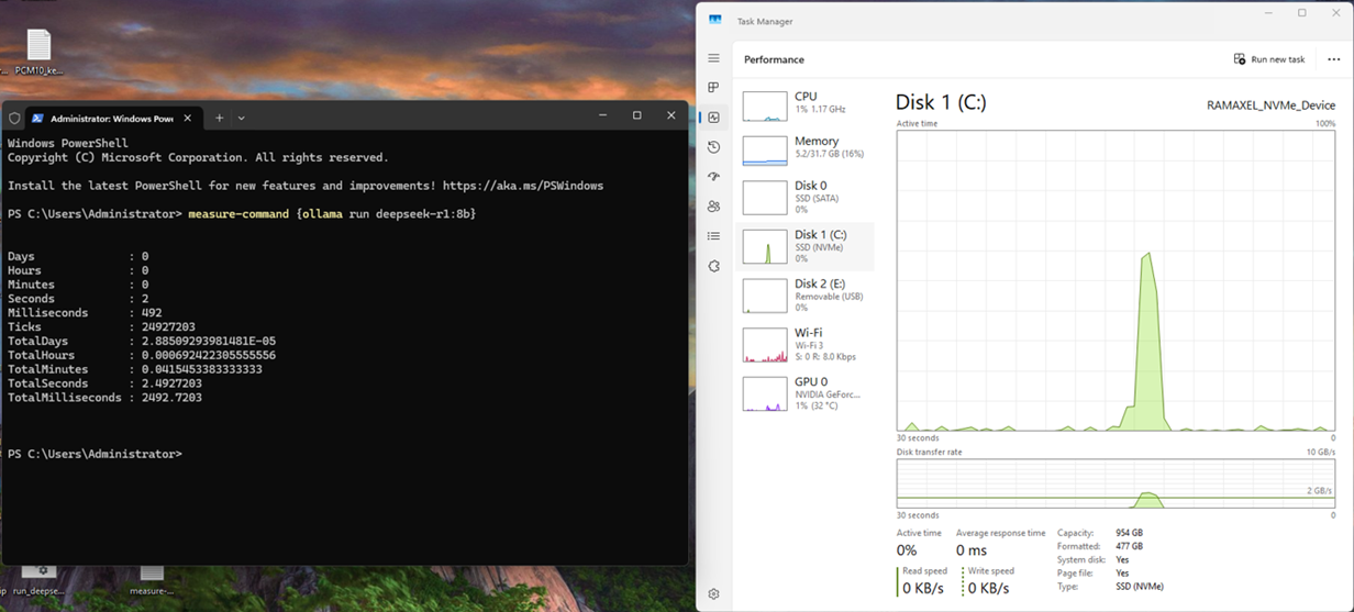為了驗(yàn)證憶聯(lián)AM541的性能及場(chǎng)景適配度,我們通過Ollama模型框架在本地部署了Deepseek-R1 8B模型,采用憶聯(lián)AM541 1TB SSD及國內(nèi)友商1TB A產(chǎn)品搭配GeForce RTX 3060 Ti 顯卡,在同等環(huán)境下進(jìn)行了模型加載測(cè)