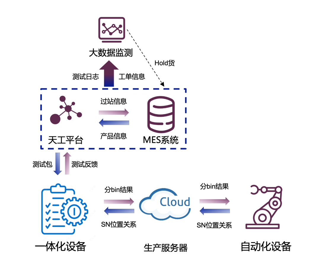 l 生產(chǎn)與測試協(xié)同:一體化設備對接天工平臺,執(zhí)行測試指令并實時反饋測試結果,天工平臺與MES系統(tǒng)交互產(chǎn)品和過站信息。