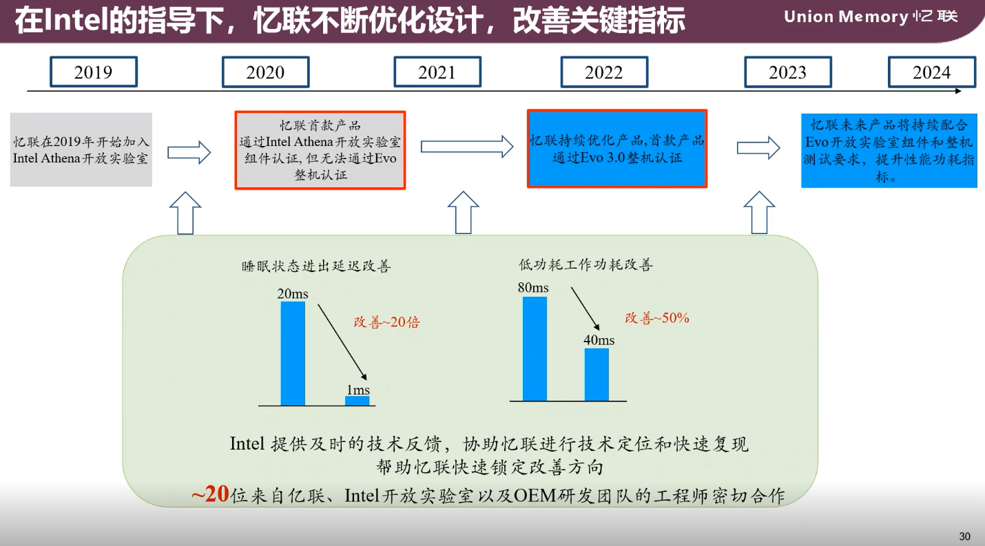 為了達到以上要求,憶聯在2019年便加入英特爾雅典娜開放實驗室,過去幾年里與英特爾保持密切合作。在來自憶聯、英特爾開放實驗室、OEM研發團隊約20位工程師的共同努力下,憶聯持續優化迭代產品,將睡眠狀態下進出延遲由20ms降低至1ms,響應速度提升了20倍,低功耗則優化了50%,并最終通過了Evo認證。整個過程中英特爾提供了非常及時的技術反饋,協助憶聯從技術定位、快速復現,包含在實驗室中提供可以區別憶聯深度解讀的數據來鎖定這些改善的方向。目前憶聯是國內在PC SSD領域中首家通過英特爾Evo整機認證的存儲廠商。