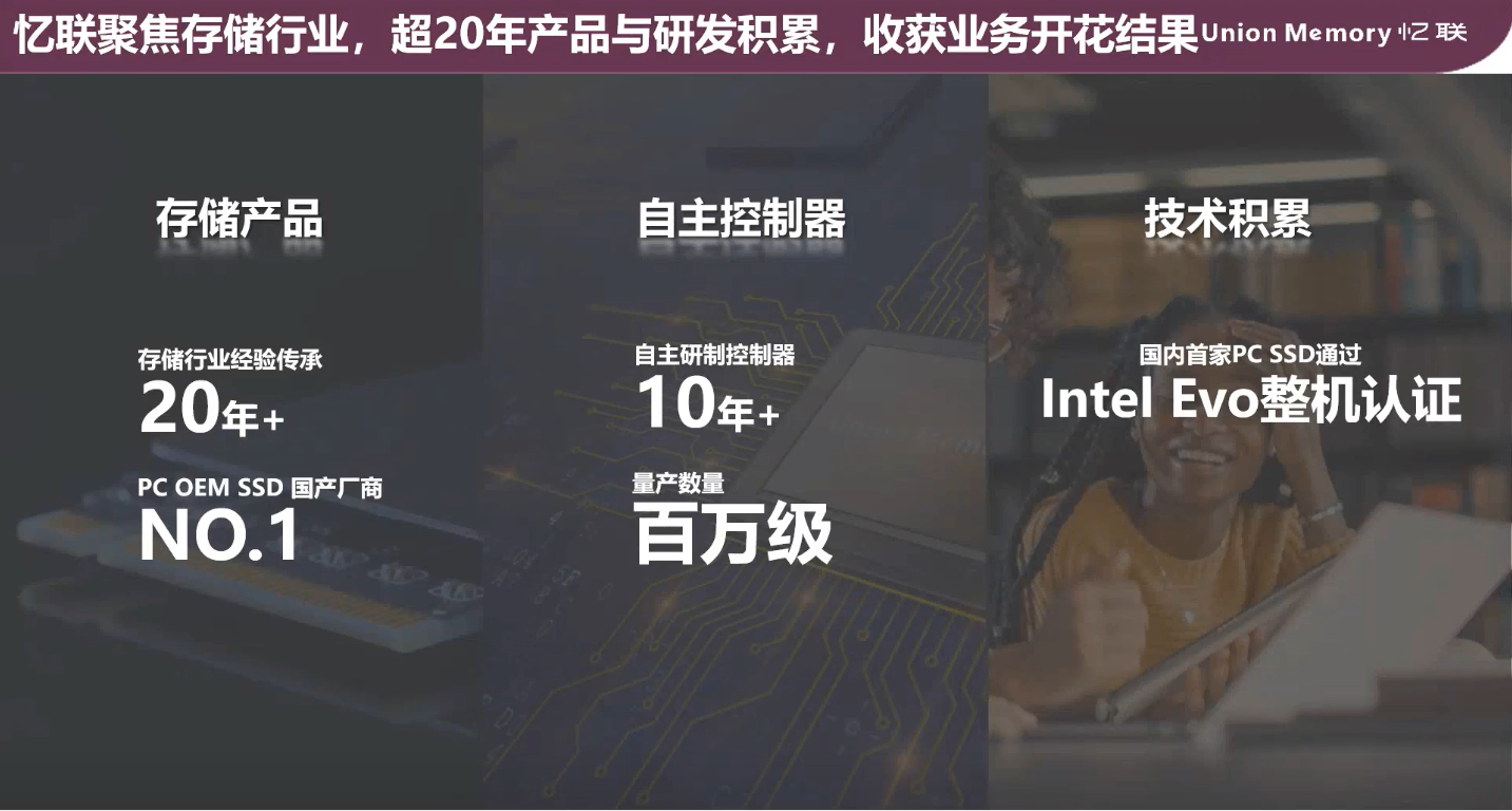 作為有著超20年產品研發經驗的國產固態存儲廠商,憶聯有著面向全領域、全生態的固態硬盤解決方案,包括應用在企業級、云化數據中心的企業級固態硬盤,面向PC、高端游戲本、高端工作站的消費級固態硬盤,還有應用在車載、手機、智能穿戴中的嵌入式存儲產品。其中消費級固態硬盤產品在PC SSD領域中占國產廠商第一名。此外,憶聯還擁有自主控制器,經過10多年的升級與迭代,目前出貨量已達百萬級。