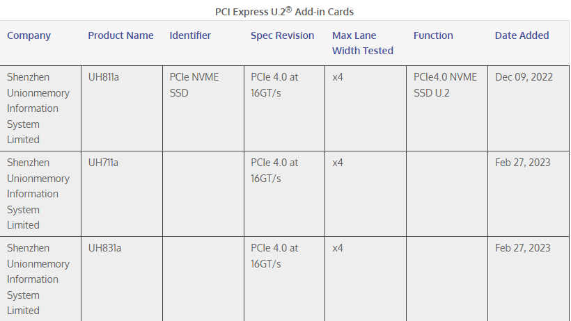 憶聯(lián)首款數(shù)據(jù)中心級SSD UH711a和企業(yè)級SSD UH811a/UH831a通過PCI-SIG Gen4 16Gbps兼容性認證,且在PCI-SIG認證產(chǎn)品列表中均已被正式收錄。