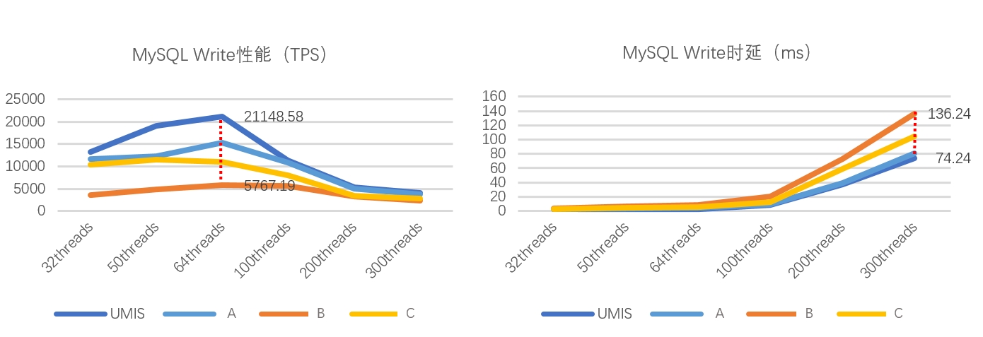 如圖 4 所示,MySQL 寫場景下,憶聯(lián) UH8 系 SSD 始終保持著明顯優(yōu)勢,性能表現(xiàn)強勁。對比友商,在吞吐量上最高可提升 266% ;在時延上最高可降低 83% 左右。意味著,在使用憶聯(lián) UH8 系 SSD 作為 MySQL 數(shù)據(jù)庫存儲介質(zhì)時,可提高整個數(shù)據(jù)庫系統(tǒng)的存儲速度。